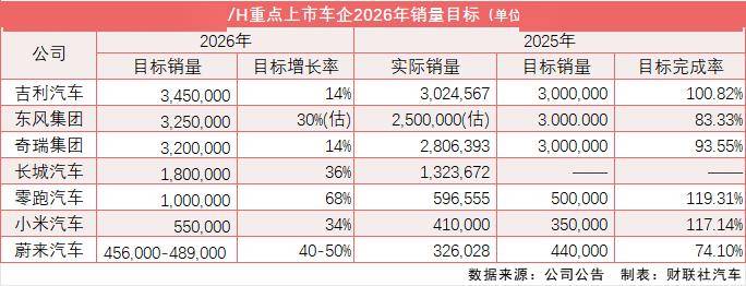 此前,在披露2025年成绩单时,零跑汽车董事长朱江明再次强调了2026年交付目标,“展望2026,我们将冲击百万销量。在产品上,A系列和D系列新品也将陆续上市。”另外,小米集团董事长雷军于1月初的直播中公布了小米汽车2026年的销量目标为55万辆,较去年实际销量增长超三成。“2026年销量目标是保持40%-50%的速度稳步增长,并提升增长质量。”蔚来董事长李斌在1月6日第100万辆量产车下线仪式上透露了今年的目标增幅。2025年蔚来累计销量为32.6万辆,以此计算,2026年其销量目标为45.6万-48.9万辆。(财联社)